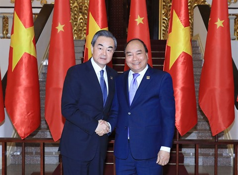 | Le Premier ministre Nguyên Xuân Phuc (droite) et le ministre chinois des Affaires étrangères Wang Yi, le 31 mars à Hanoï. |