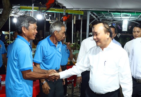 | Le Premier ministre Nguyên Xuân Phuc converse avec les agricultuteurs, dans les halls d’assemblée de Thuân Tân et Tân Quê, le 18 décembre à Dông Thap. |