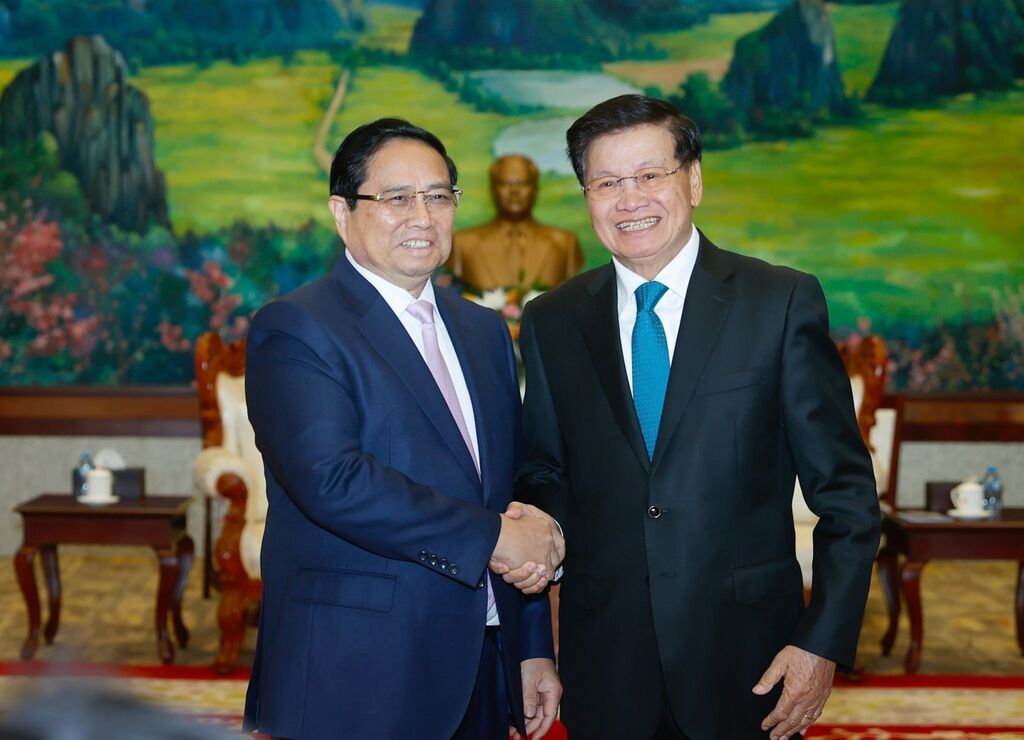 | Lors de la rencontre entre le dirigeant lao Thongloun Sisoulith (droite) et le Premier ministre Pham Minh Chinh. |