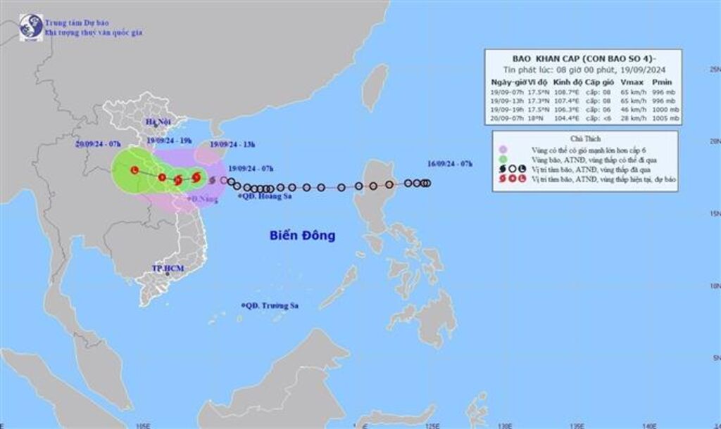 À 16h00 du 19 septembre, l'épicentre de la tempête se trouverait à environ 210 km au nord-est de Dà Nang et à 260 km à l'est de Quang Tri. Les vents les plus forts près de l'épicentre de la tempête sont prévus d'atteindre le niveau 8 (62-74 km/h), avec des rafales jusqu'au niveau 10. La tempête se déplace vers l'ouest à une vitesse d'environ 20 km/h.