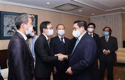 | Le Premier ministre Pham Minh Chinh (droite) et des intellectuels vietnamiens au Japon, le 23 novembre à Tokyo. |