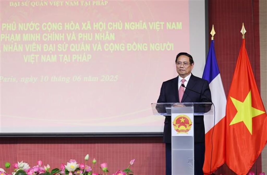 | Le Premier ministre Pham Minh Chinh prenant la parole lors de la rencontre avec le personnel de l'ambassade du Vietnam et des représentants de la communauté vietnamienne en France, le 10 juin à Paris. |