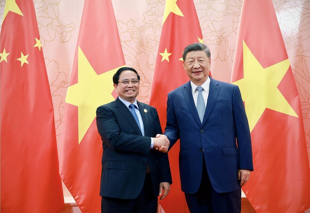 | Le Premier ministre Pham Minh Chinh (gauche) et le secrétaire général et président chinois Xi Jinping. |