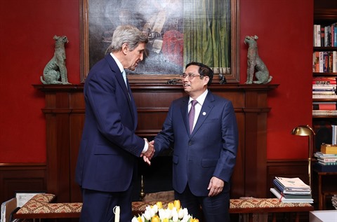 | Le Premier ministre vietnamien Pham Minh Chinh (droite) et l'envoyé spécial du président américain pour le climat John Kerry, le 14 mai à Boston (États-Unis). |
