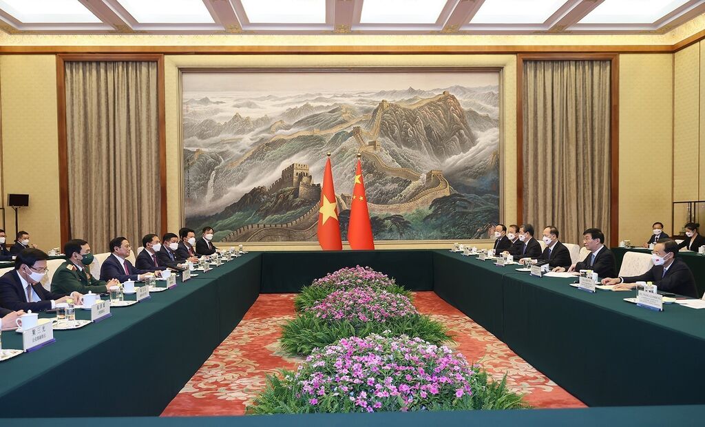 | Le Premier ministre Pham Minh Chinh (gauche) et Wang Huning, président du Comité national de la Conférence consultative politique du peuple chinois. |