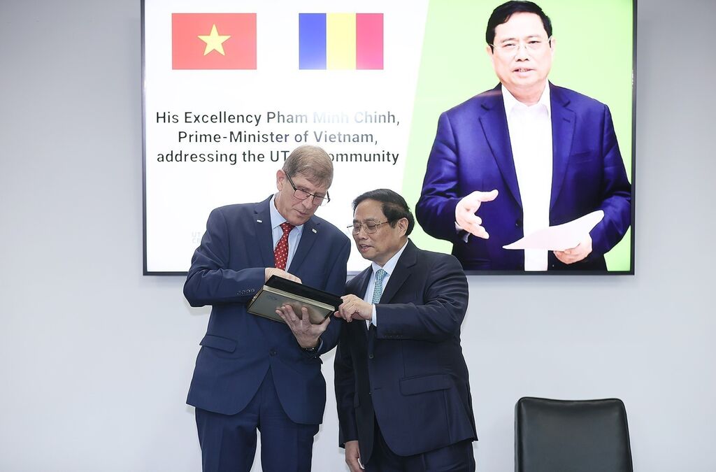 | Le Premier ministre Pham Minh Chinh (droite) à l'Université technique de construction de Bucarest. |