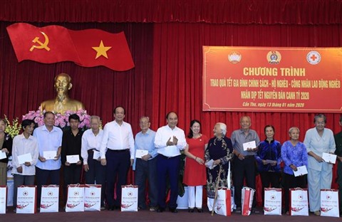 | Le PM présente des cadeaux du Têt à des personnes démunies à Cân Tho. |