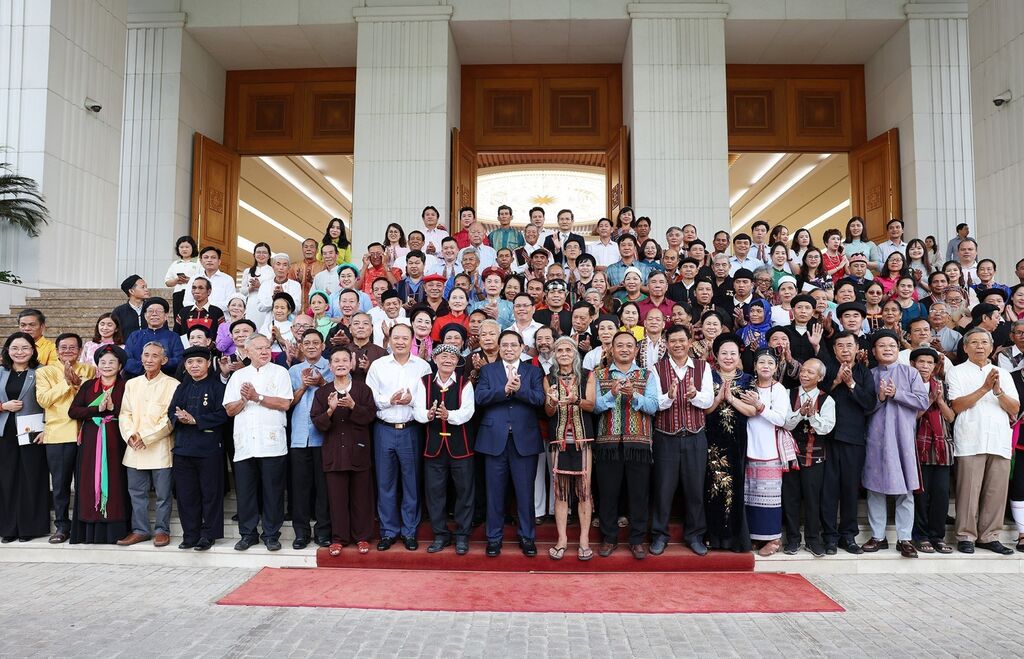 | Photo de famille entre le PM Pham Minh Chinh et les patriarches, chefs de village, artisans et personnalités prestigieuses. |