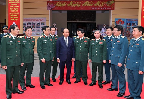 | Le Premier ministre Nguyên Xuân Phuc (centre) et des soldats et officiels de la Division de la défense aérienne 361, le 8 février à Hanoï. |