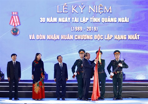 | Le Premier ministre Nguyên Xuân Phuc remet l'Ordre de l'Indépendance de première classe à la province de Quang Ngai, lors de la célébration du 30e anniversaire de son rétablissement tenue le 2 juillet. |