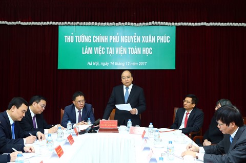 | Séance de travail entre le Premier ministre Nguyên Xuân Phuc (debout) et des responsables de l’Institut de mathématiques du Vietnam. |