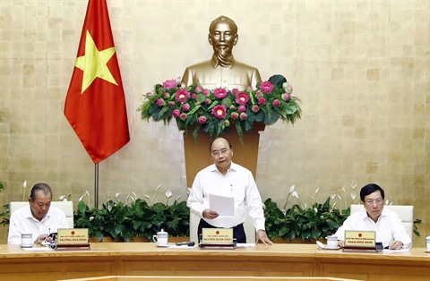 | Le Premier ministre Nguyên Xuân Phuc (debout) dans une séance de travail avec la Permanence du gouvernement et le Comité de gestion des fonds publics chez les entreprises le 17 juillet. |