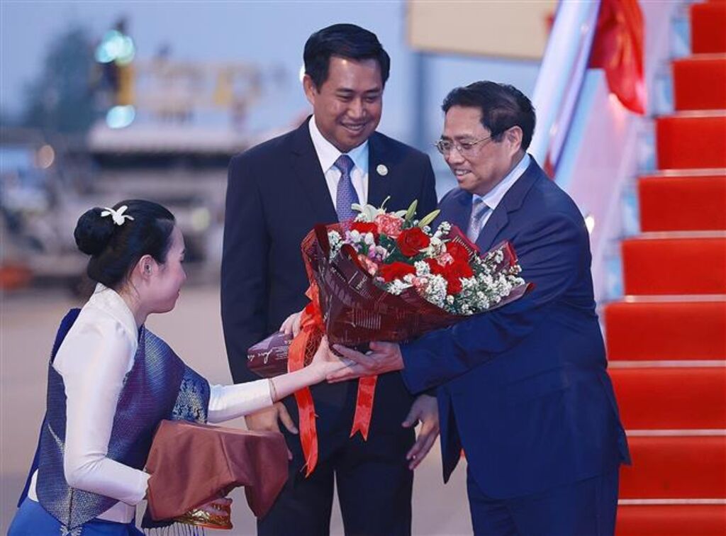 | Le Premier ministre Pham Minh Chinh (droite) arrive le soir du 4 avril au Laos. |