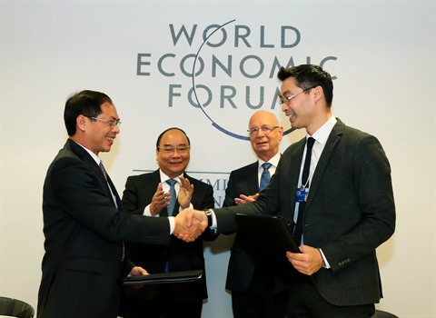 | Nguyên Xuân Phuc (2e gauche) et Klaus Schwab (2e droite) assistent, le 19 janvier à Davos, à la cérémonie de signature de l’accord de coopération entre le Vietnam et le FEM sur le développement de l’économie vietnamienne. |