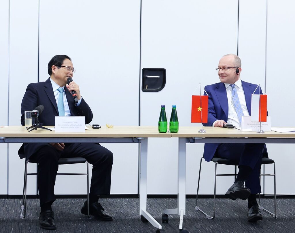 | Le Premier ministre vietnamien Pham Minh Chinh (gauche) et le responsable de l'Institut national de recherche sur la cybersécurité (NASK) de Pologne lors d'une rencontre tenue le 17 janvier à Varsovie. |