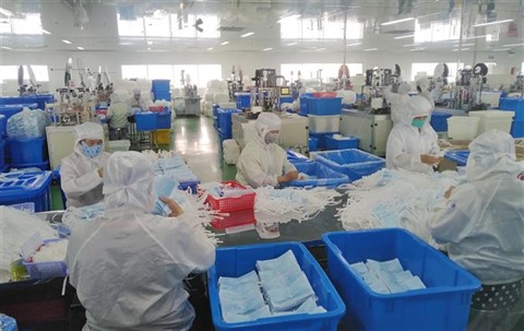 | Dans une usine de production de masque médical de SanQi Vietnam à Tiên Giang (Sud). |