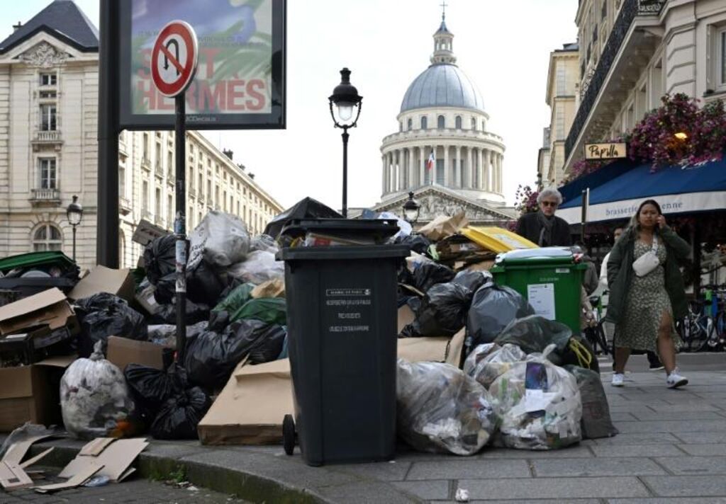 | Des piétons passent devant des poubelles à Paris, près du Panthéon, le 20 mars. |
