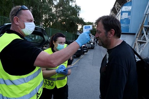 | Prise de température d'un journaliste avant un match de football à huis clos à Zagreb, le 7 juin. |