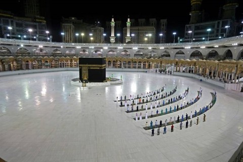 | Une poignée de fidèles autorisés prie devant la Kaaba, à La Mecque, le 23 juin. |