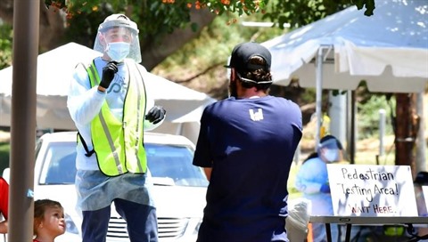 | Un homme attend devant un centre de test, le 30 juin à Los Angeles. |