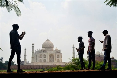 | Des passants prennent des photos du Taj Mahal à Agra (Inde), le 8 septembre. |