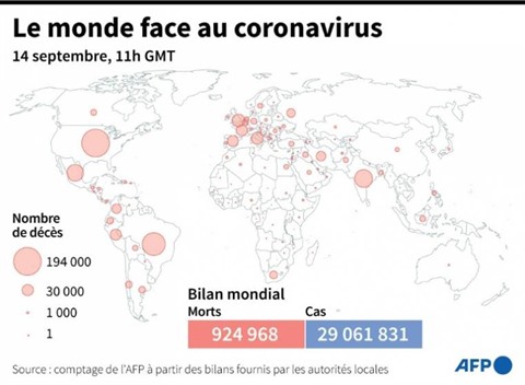 La pandémie provoquée par le nouveau coronavirus a fait au moins 924.968 morts dans le monde depuis fin décembre, selon un bilan établi par l'AFP à partir de sources officielles lundi 14 septembre à la mi-journée.