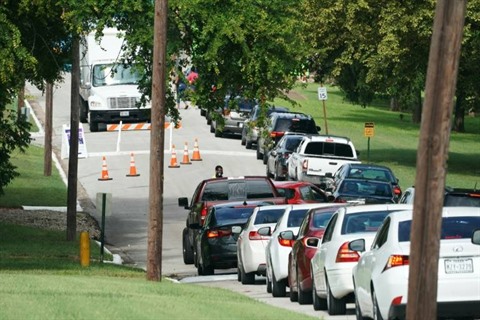 | Attente devant un site de test au COVID-19 au Paul Quinn College à Dallas (États-Unis) le 29 juillet. |