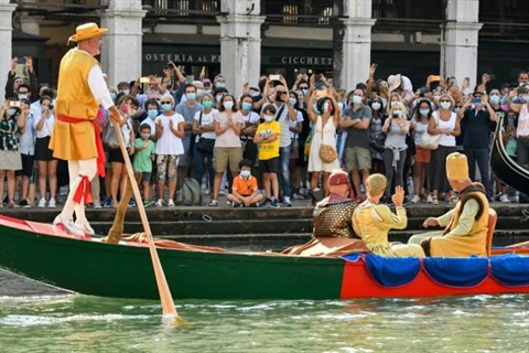 | Des spectateurs masqués assistent à un défilé traditionnel de gondoles à Venise le 6 septembre. |