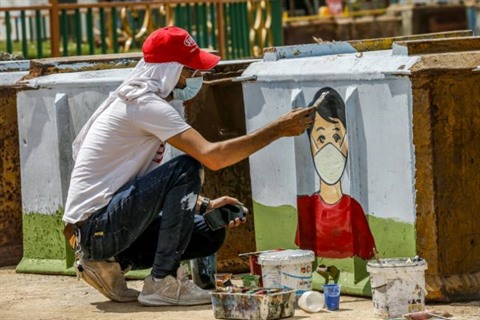 | Un homme peint une fresque murale à Rafah (Bande de Gaza) le 6 septembre. |