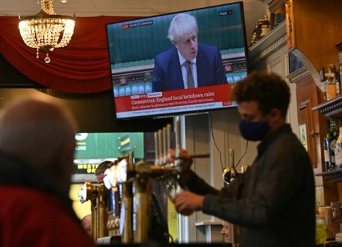 | Les clients d'un pub à Liverpool suivent à la TV un discours du Premier ministre Boris Johnson, le 12 octobre. |