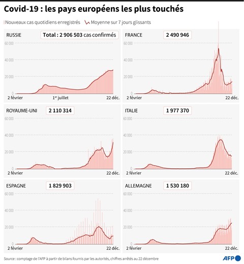 La pandémie a fait au moins 1,7 million de morts dans le monde depuis fin décembre, selon un bilan établi par l'AFP à partir de sources officielles mercredi à 11h00 GMT.