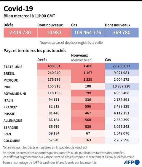 La pandémie a fait au moins 2,4 millions de morts dans le monde depuis fin décembre 2019, selon un bilan établi par l'AFP à partir de sources officielles mercredi en milieu de journée.