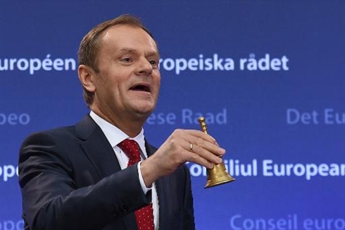 | Le nouveau président du Conseil européen Donald Tusk avec sa clochette offerte lors de sa prise de fonction, le 1er décembre à Bruxelles. |