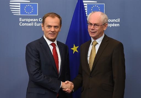 | Herman van Rompuy (droite), président sortant du Conseil de l'Europe, accueille son successeur Donald Tusk, le 1er décembre à Bruxelles. |
