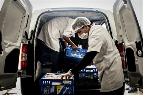 | Des employés de la cantine de l'école Loios de Lisbonne préparent des repas pour les plus démunis, 14 avril à Lisbonne, au Portugal. |