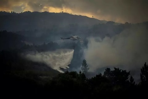 | Un hélicoptère des pompiers déverse de l'eau sur un incendie à Orjais, au pied du Parc naturel de la serra da Estrela (Centre du Portugal), le 16 août. |