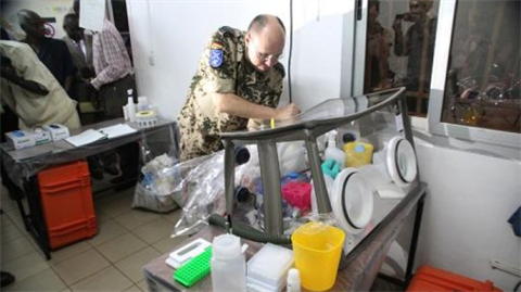 | Le docteur allemand Roman Woelfel présente un laboratoire mobile de diagnostic du virus Ebola, financé par l'Allemagne. |
