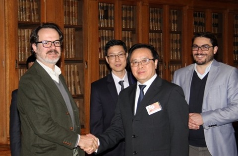 | Hoàng Binh Quân (1er plan, à droite) et le président de la Commission des affaires étrangères du Parlement portugais, Sergio Sousa Pinto. |