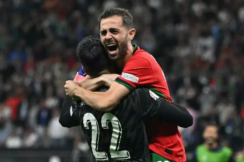 | Bernardo Silva et le gardien Diogo Costa célèbrent la victoire du Portugal aux tirs au but contre la Slovénie lundi soir 1er juillet en huitième de finale de l'Euro, à Francfort. |