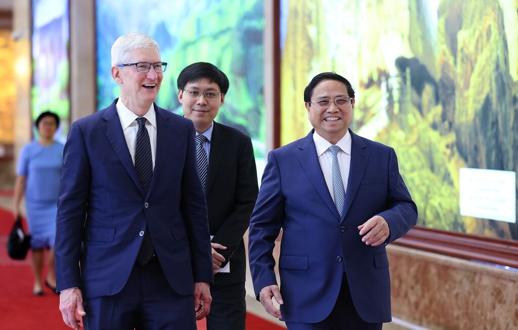 | Le Premier ministre Pham Minh Chinh (droite) reçoit Tim Cook, directeur général d’Apple, le 16 avril à Hanoï. |