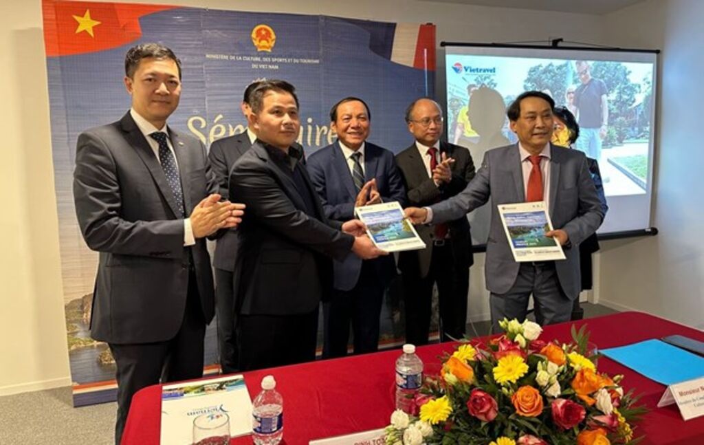 Dans le cadre du séminaire, le ministre Nguyên Van Hùng et l’ambassadeur du Vietnam en France, Dinh Toàn Thang, et les représentants de l’Autorité nationale du tourisme du Vietnam ont assisté à la remise du protocole de coopération entre la filiale de Vietravel en France et Vietnam Airlines, et le protocole de coopération entre le Centre culturel du Vietnam en France et l’Association vietnamienne de promotion du tourisme culturel en France et en Europe.