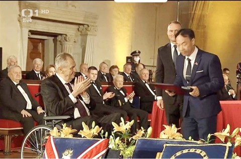 | Trinh Tân (droite), membre du Conseil des minorités ethniques de la Moravie du Nord et de la ville d’Ostrava, honoré par l’État tchèque, le 7 mars à Prague. |