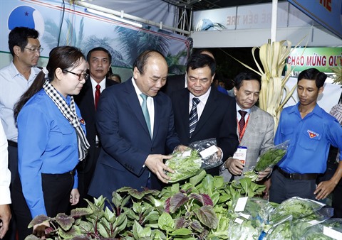 | Le Premier ministre Nguyên Xuân Phuc (2e à gauche) visite un stand lors d'une exposition dans le cadre de la fête des start-up, le 19 juillet à Bên Tre (Sud). |