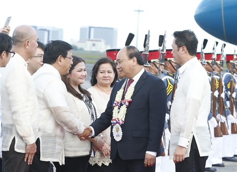 | Le Premier ministre Nguyên Xuan Phuc (tenue noir) à l'aéroport de Clark dans la province de Pampanga (Philippines). |