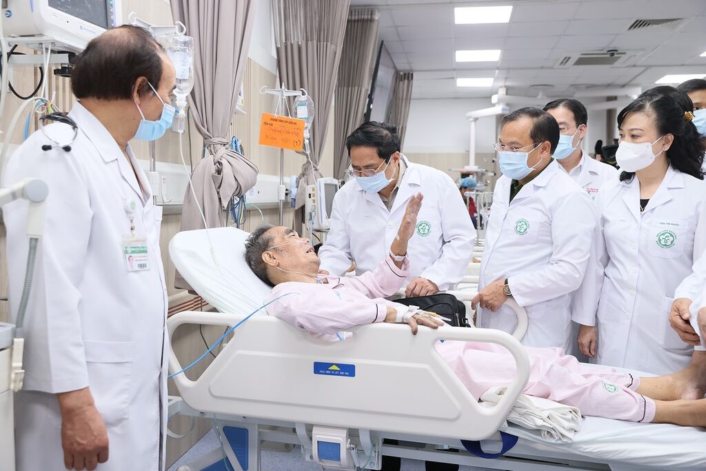 | Le Premier ministre Pham Minh Chinh (centre) rend visite aux victimes de l'incendie, à l'hôpital Bach Mai, à Hanoï. |