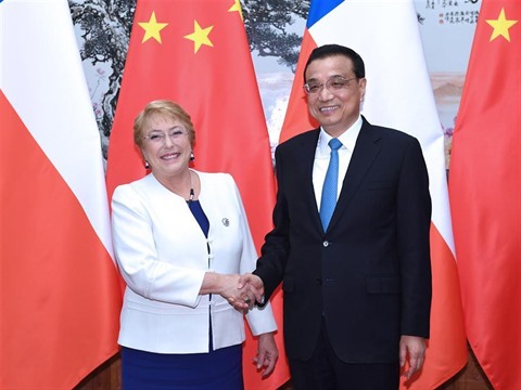 | Le Premier ministre chinois Li Keqiang et la présidente chilienne Michelle Bachelet, le 14 mai en Chine. |