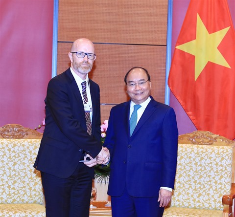 | Le Premier ministre Nguyên Xuân Phuc (droite) et le vice-président de Facebook chargé de la politique publique en Asie-Pacifique, Simon Milner. |