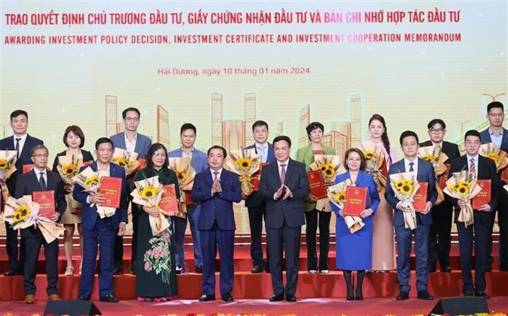 Lors de la conférence, Hai Duong a annoncé une liste des projets d’appel à l’investissement, et remis 27 décisions de politique d’investissement, certificats d’investissement et protocoles de coopération en matière d’investissement à des entreprises et investisseurs nationaux et étrangers, avec un capital total de près de 1,4 milliard d'USD dans les domaines des infrastructures de parcs industriels, de la logistique, de l’industrie de la transformation et de la fabrication, de l’industrie de haute technologie, des équipements électroniques.