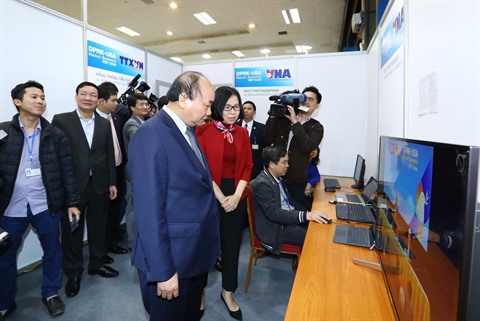 | Le Premier ministre Nguyên Xuân Phuc (au premier rang) visite le stand de l'Agence Vietnamienne d'Information au Centre international des médias. |