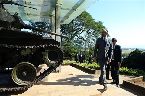 | Le Premier ministre français Édouard Philippe se tient à côté d’un tank français détruit sur la colline A1 durant la campagne de Diên Biên Phu. |